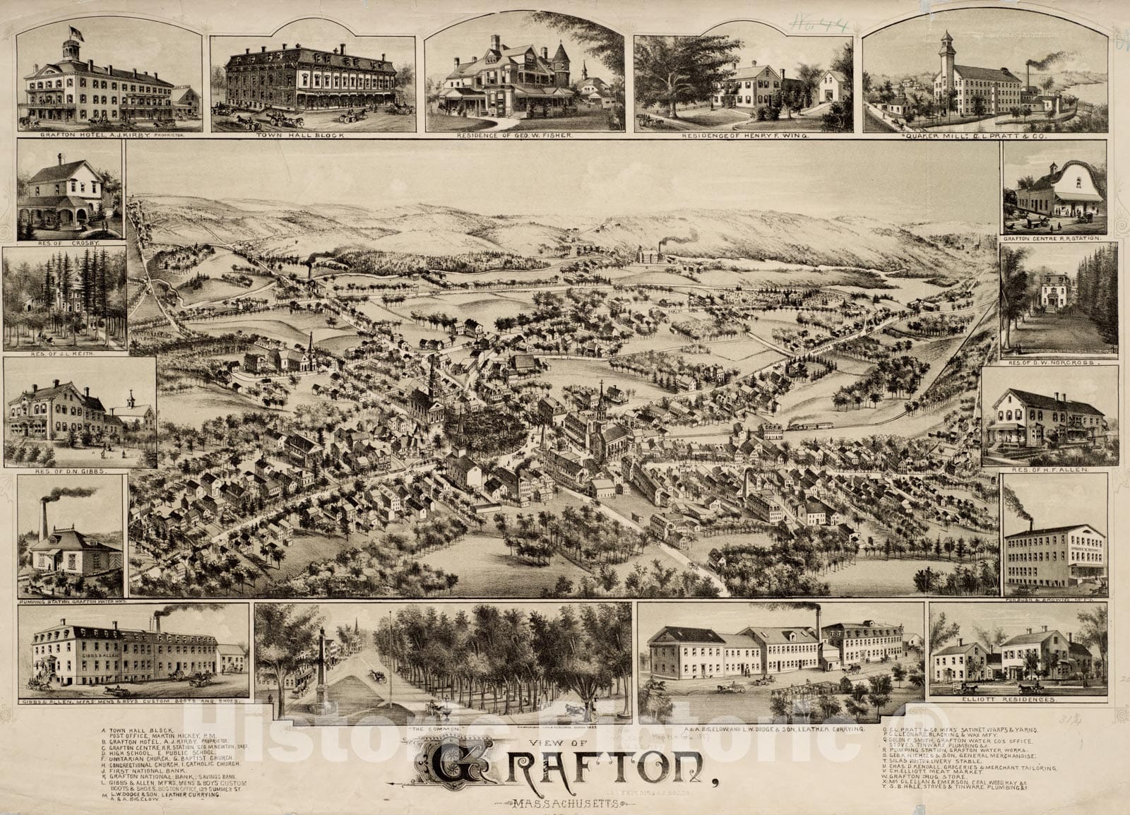 Historical Map, View of Grafton, Massachusetts : 1887, Vintage Wall Art