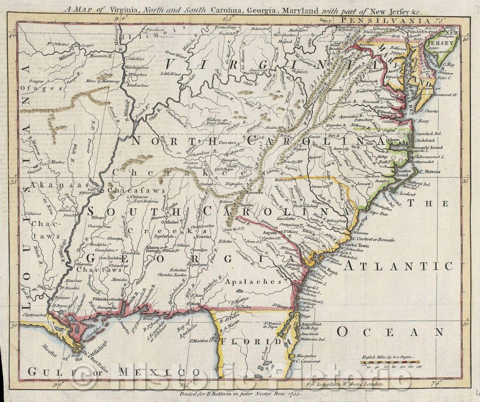 • .Historic Map : A Map of Virginia, North and South Carolina, Georgia, Maryland with part of New Jersey andc., 1755 , Vintage Wall Art