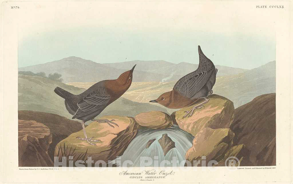 American Water Ouzel, from Birds of America by John James Audubon, etched by Robert Havell. Birds of America is a book by naturalist and painter John James Audubon, containing colorfull illustrations of birds of the United States, first published in Edinburgh and London in 1827. The book consists of 435 hand-coloured prints made from engraved plates. It includes images of six, now-extinct birds. Art historians describe Audubon's work as printed with "artistic finesse". Audubon also authored the companion book Ornithological Biographies, The original Birds of America is the most valuable printed book's available and is highly prized by rare book collectors.