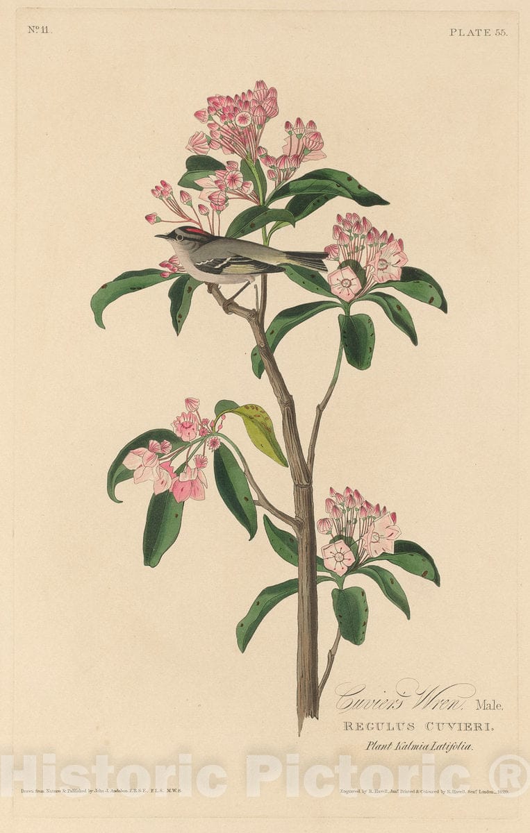 Cuvier's Wren, from Birds of America by John James Audubon, etched by Robert Havell. Birds of America is a book by naturalist and painter John James Audubon, containing colorfull illustrations of birds of the United States, first published in Edinburgh and London in 1827. The book consists of 435 hand-coloured prints made from engraved plates. It includes images of six, now-extinct birds. Art historians describe Audubon's work as printed with "artistic finesse". Audubon also authored the companion book Ornithological Biographies, The original Birds of America is the most valuable printed book's available and is highly prized by rare book collectors.