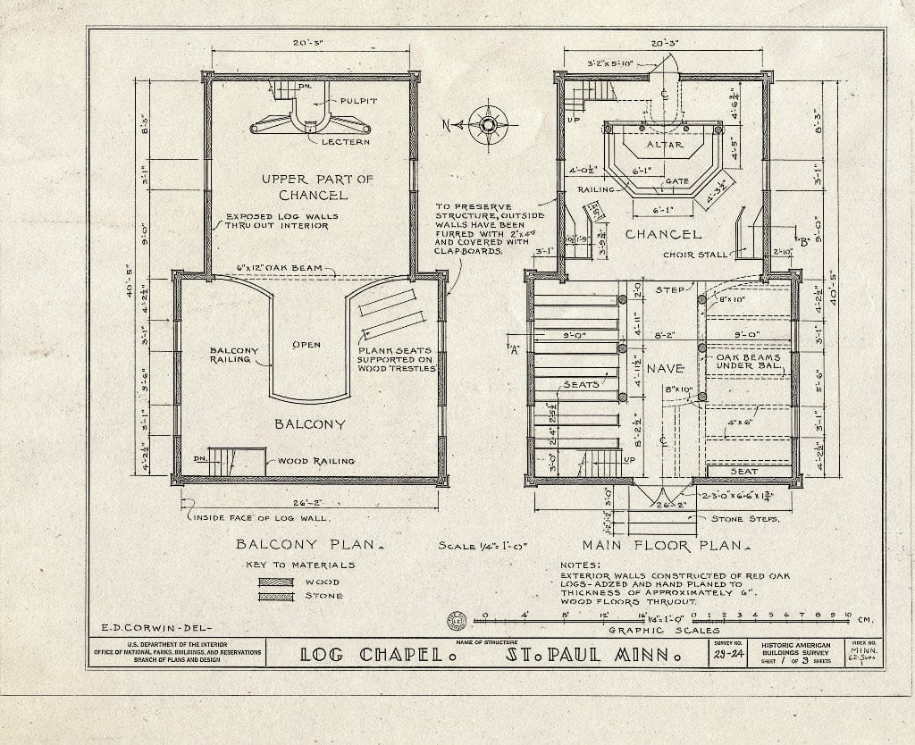 • .Blueprint 1. Balcony and Main Floor Plans - Log Chapel, Saint Paul, Ramsey County, MN