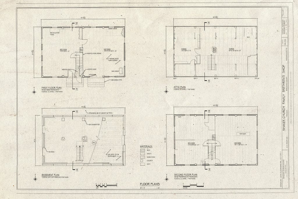 Blueprint 1. Basement Plan, First Floor Plan, attic Plan, Second Floor Plan - Shaker Church Family Brethren's Shop, U.S. Route 20, Hancock, Berkshire County, MA