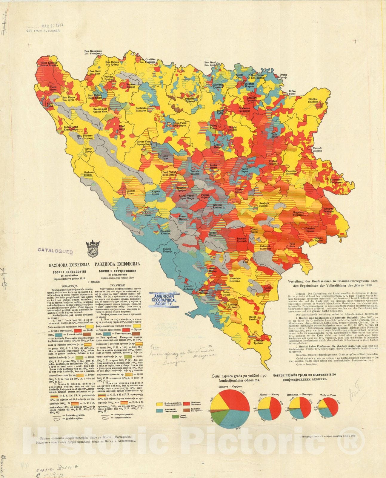 Map : Bosnia and Hercegovina 1910, Razdioba Konfesija u Bosni i Hercegovina po resultatima popisa ziteljstva godine 1910, Antique Vintage Reproduction