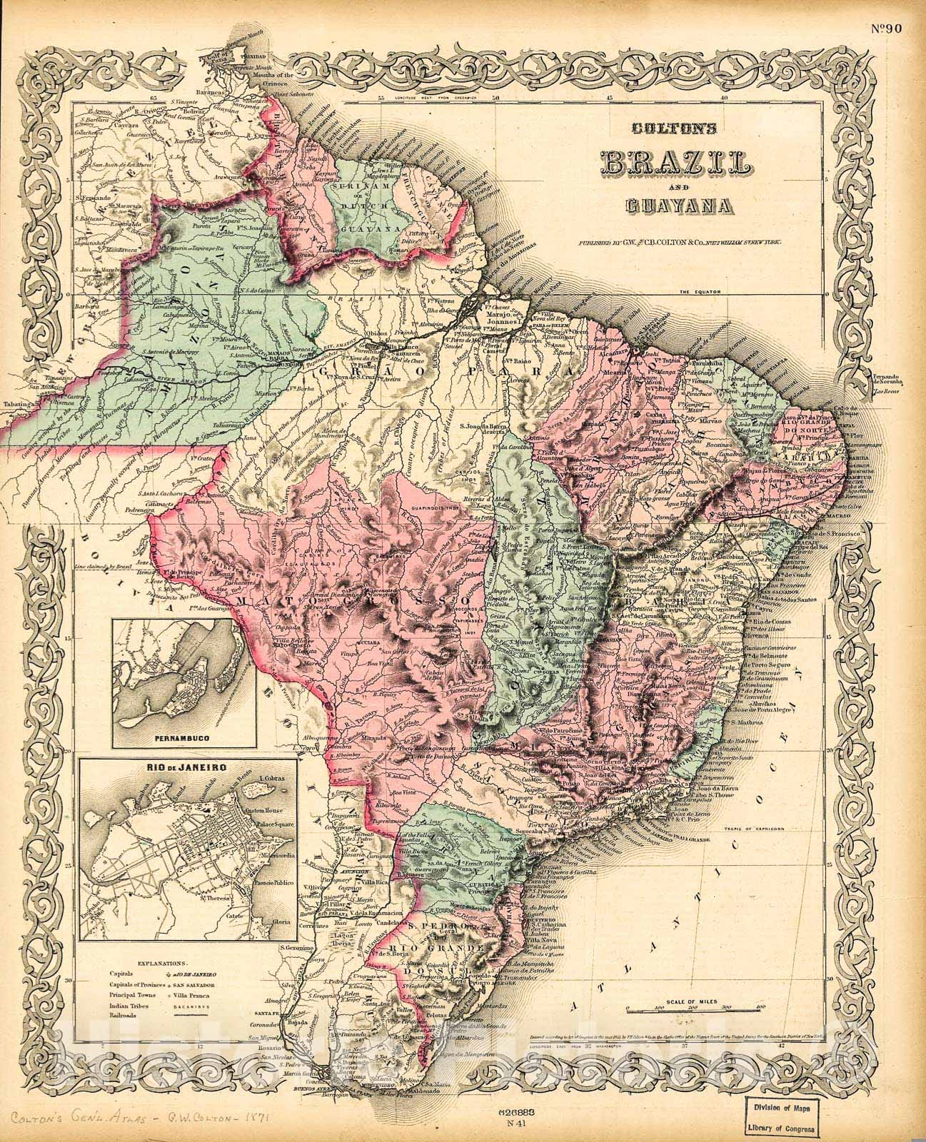 Historic 1871 Map - Colton's Brazil with Guayana.