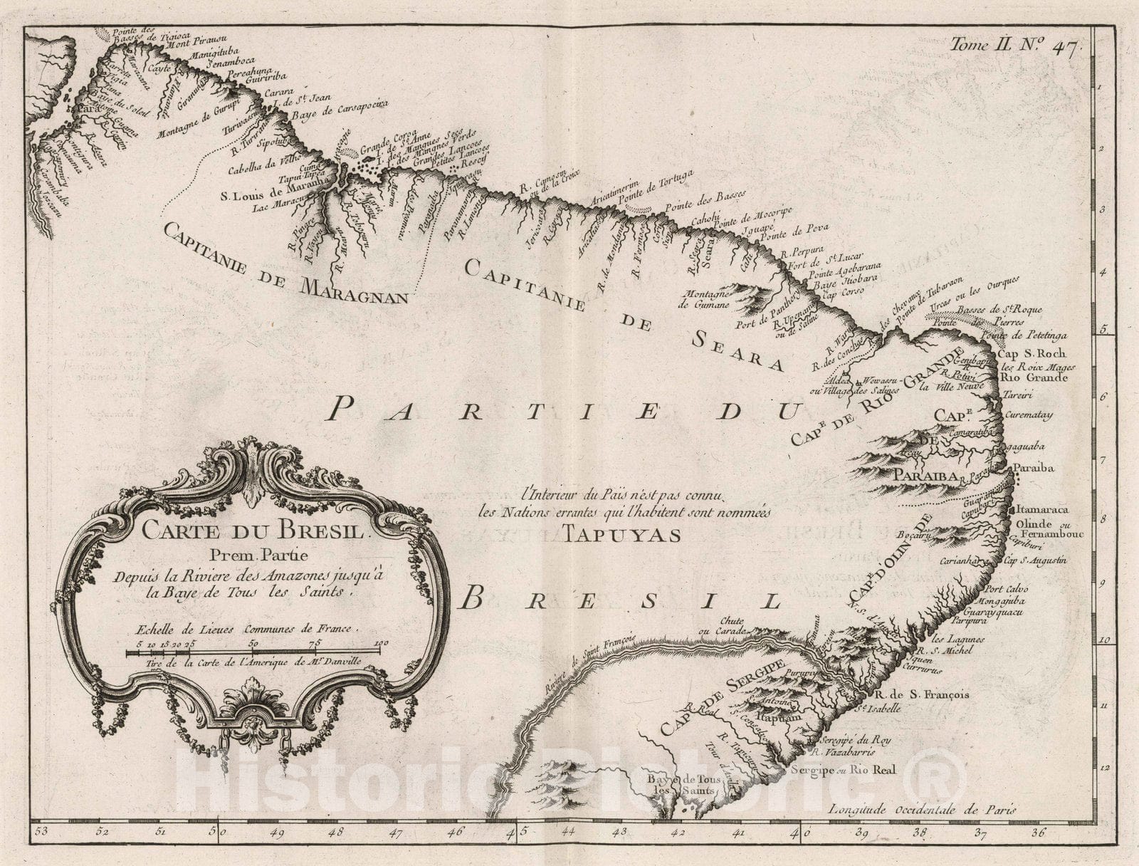 Brazil, 1764 Carte du Bresil, prem Partie depuis la Riviere des Amazones jusqu'a la Baye de Tous les Saints. , Vintage Wall Art