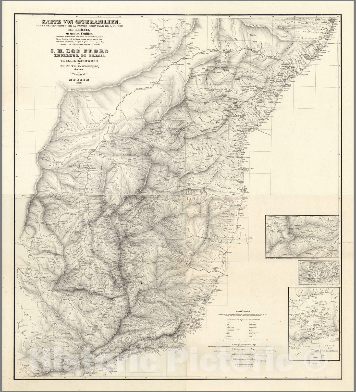 (Composite map of) Karte von Ost-Brasilien. Carte geographique de la partie orientale de l'empire du Bresil, en quatre Feuilles : contenant les provinces maritimes de Pernambuco jusqua Rio de Janeiro, celle de Minas Geraes, et une partie des provinces limitrophes, redigee d'apres leures propres observations et les cartes les plus exactes, et dediee A S.M. Don Pedro Empereur du Breso; par Guill de Eschwege et Ch. F. Ph. de Martius; dressee par I. Schwarzmann. Munich 1831. (insets) Les environs de Villa Rica. (with) Les environs de Rio de Janeiro. (with) Bahia do Rio de Janeiro. | Karte von Ost-Brasilien. Carte geographique de la partie orientale de l'empire du Bresil, en quatre Feuilles : contenant les provinces maritimes de Pernambuco jusqua Rio de Janeiro, celle de Minas Geraes, et une partie des provinces limitrophes, redigee d'apres leures propres observations et les cartes les plus exactes, et dediee A S.M. Don Pedro Empereur du Breso; par Guill de Eschwege et Ch. F. Ph. de Martius; dressee par I. Schwarzmann. Munich 1831. (insets) Les environs de Villa Rica. (with) Les environs de Rio de Janeiro. (with) Bahia do Rio de Janeiro. | 1 map of eastern Brazil on 4 sheets, 97x86. Sheets 70x52. Title on sheet 1. Relief shown by shading and spot heights. Shows rivers, cities and towns. Includes abbreviations and explanations of symbols. Title in French and German. Insets on sheet 4.