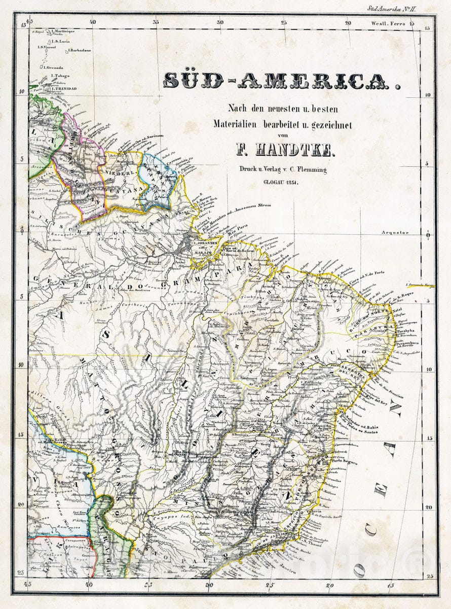Historic Map : Brazil; Guyana, , South America 1855 Sud-America II. , Vintage Wall Art