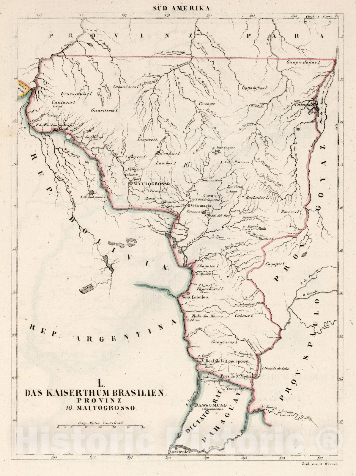 L. Das Kaiserthum Brasilien. Provinz 16. Mattogrosso. (on top margin) Sud Amerika. Lith. v. W. Werner. (to accompany) Atlas von Amerika in 30 Charten und einem erlauterndem Texte. | Atlas von Amerika in 30 Charten und einem erlauterndem Texte. Entworfen von W. E. A. von Schlieben ; die Charten lithographirt, Werner. Leipzig, bei George Joachim Goschen, 1830. | Atlas of America, with 54 pages of text, index, abbreviations,and outline hand color maps, some folded. Includes Index. Bound in beige cardboard covers with decorative border, 35x26.5, title " W. E. A. von Schlieben, Atlas von Amerika. Leipzig, bei George Joachim Goschen".