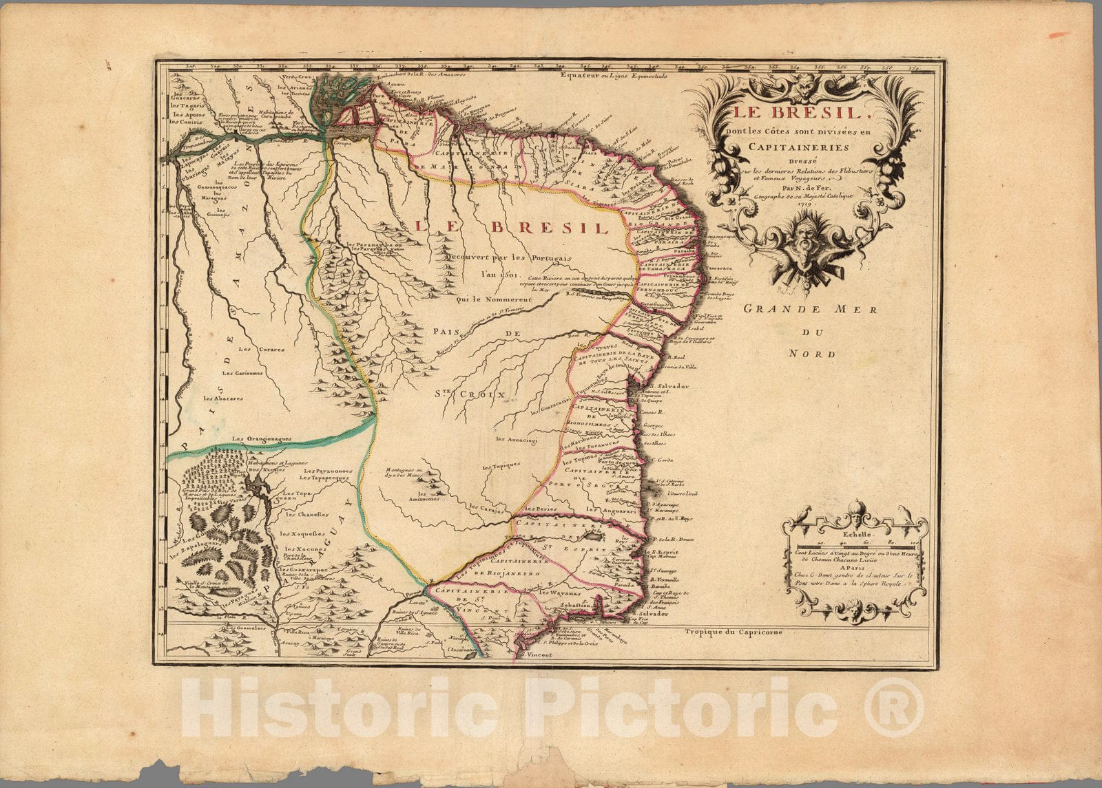 Historic Map : Brazil,Le Bresil dont les cotes sont divisees en capitaineries. 1719 , Vintage Wall Art