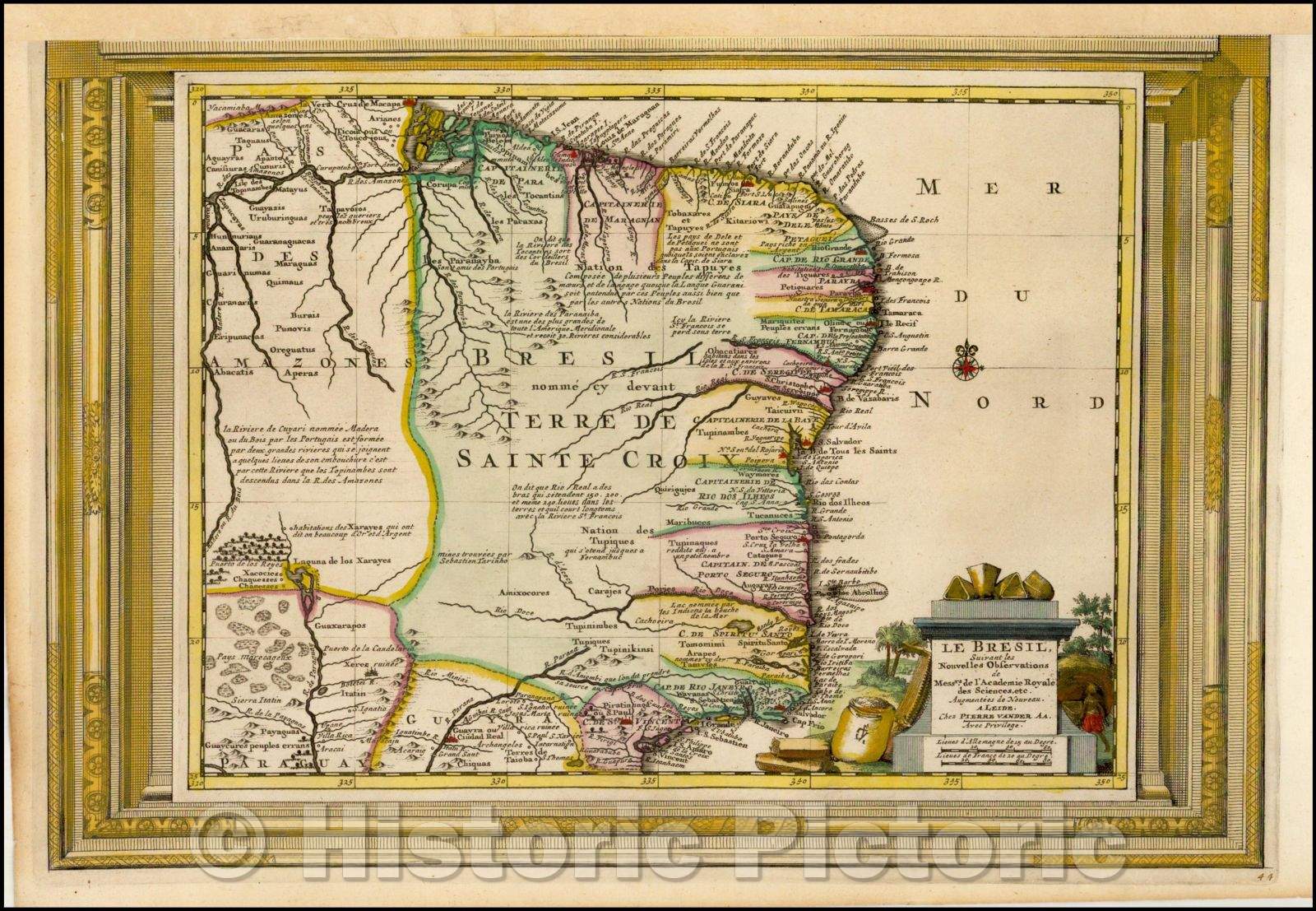 • .Historic Map - Le Bresil Suivant les Nouvelles Observations/Vander Aa's Map of Brazil, 1713, Pieter van der Aa - Vintage Wall Art