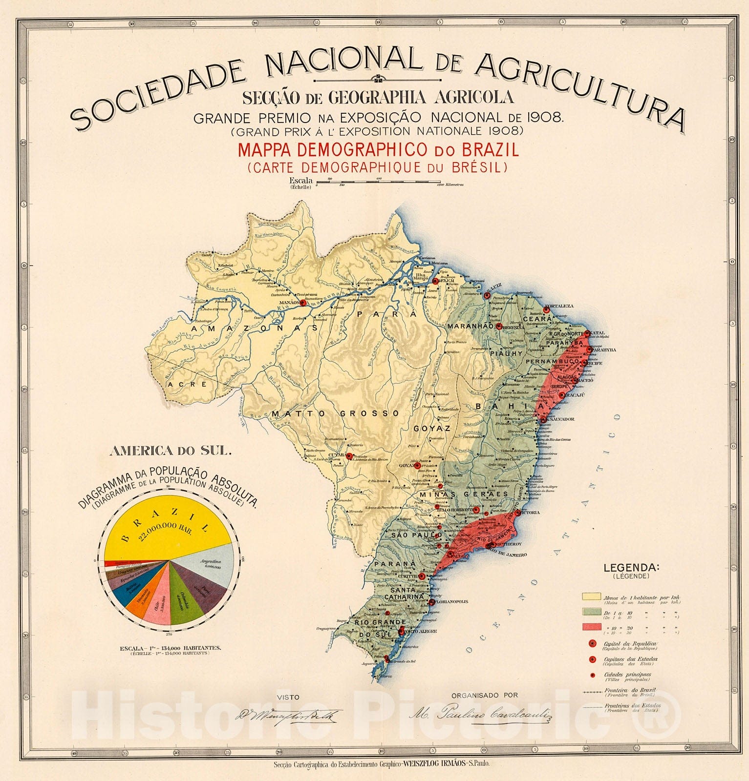 Historic Map : Mappa demographico do Brazil (Carte demographique du Brasil), 1908, v1, Vintage Wall Decor