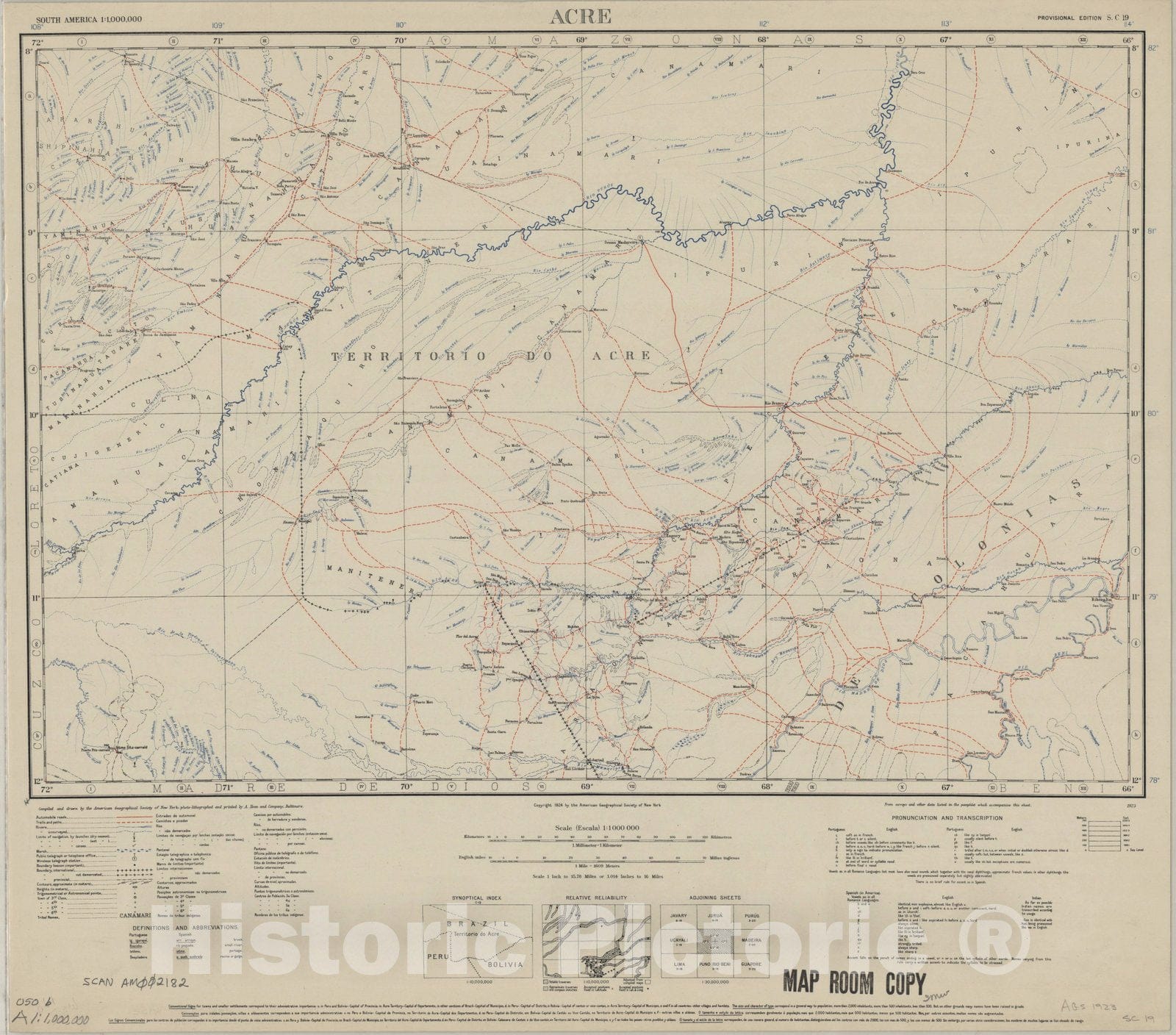 Map : Acre (uncolored), Brazil, Peru and Bolivia 1923, Map of Hispanic America, Antique Vintage Reproduction