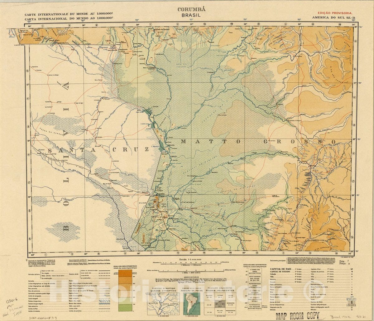 Map : Corumba, Brazil 1922, Carte Internationale du monde au 1.000.000. Corumba?, Brasil, America do Sul S.E. - 21, Antique Vintage Reproduction