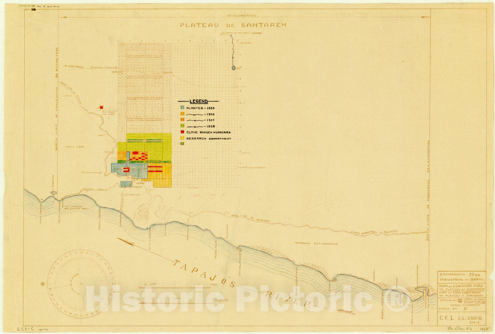 • .Map : Fordlandia, Brazil 1938, Mapa da Concessa?o Ford no plateau de Santarem, Map of Ford Concession on Plateau of Santarem , Antique Vintage Reproduction