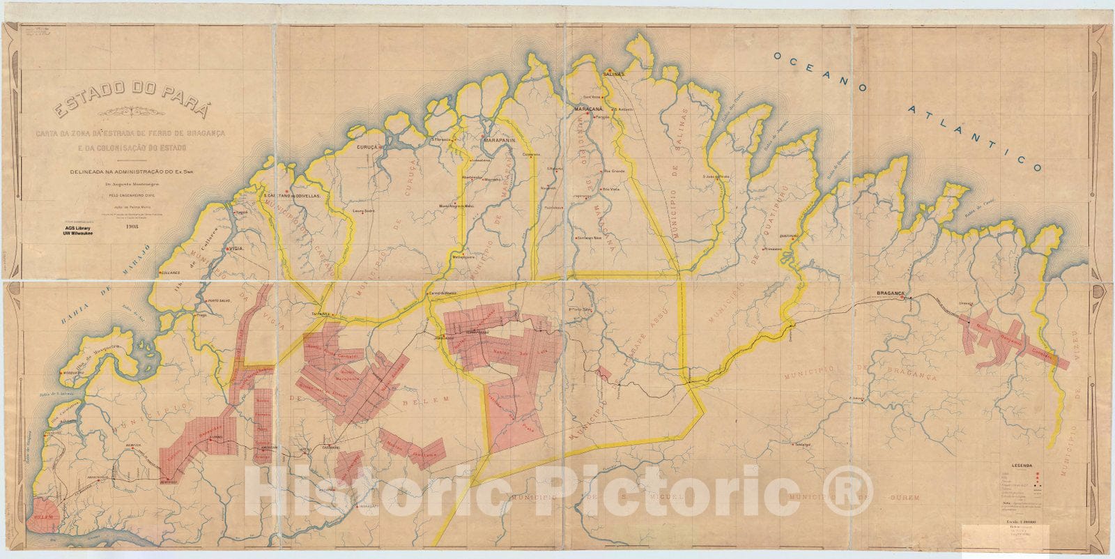 Map : Para, Brazil 1908, Estado do Para : carta da zona da estrada de ferro de Braganca e da colonisac do Estado , Antique Vintage Reproduction