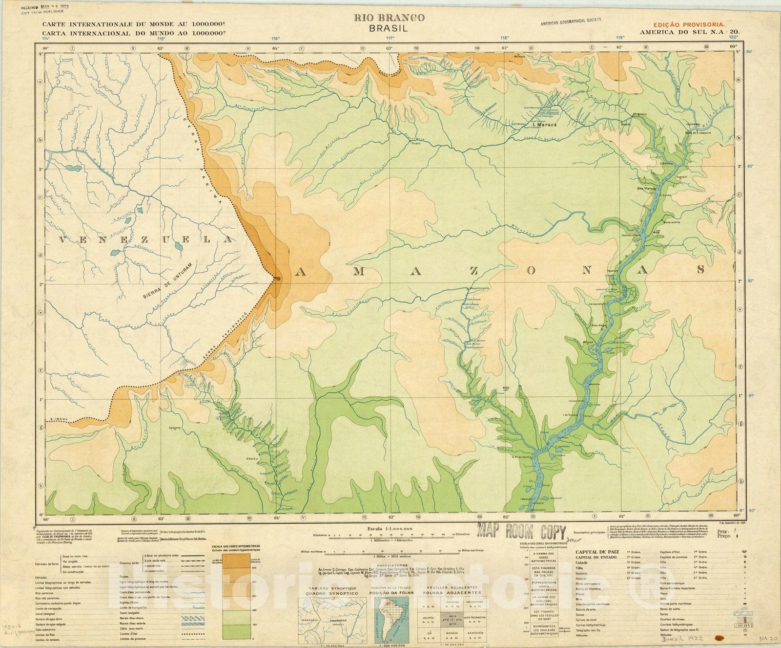 • Map : Rio Branco, Brazil 1922, South America 1:1,000,000 Rio Branco, Brasil, Antique Vintage Reproduction