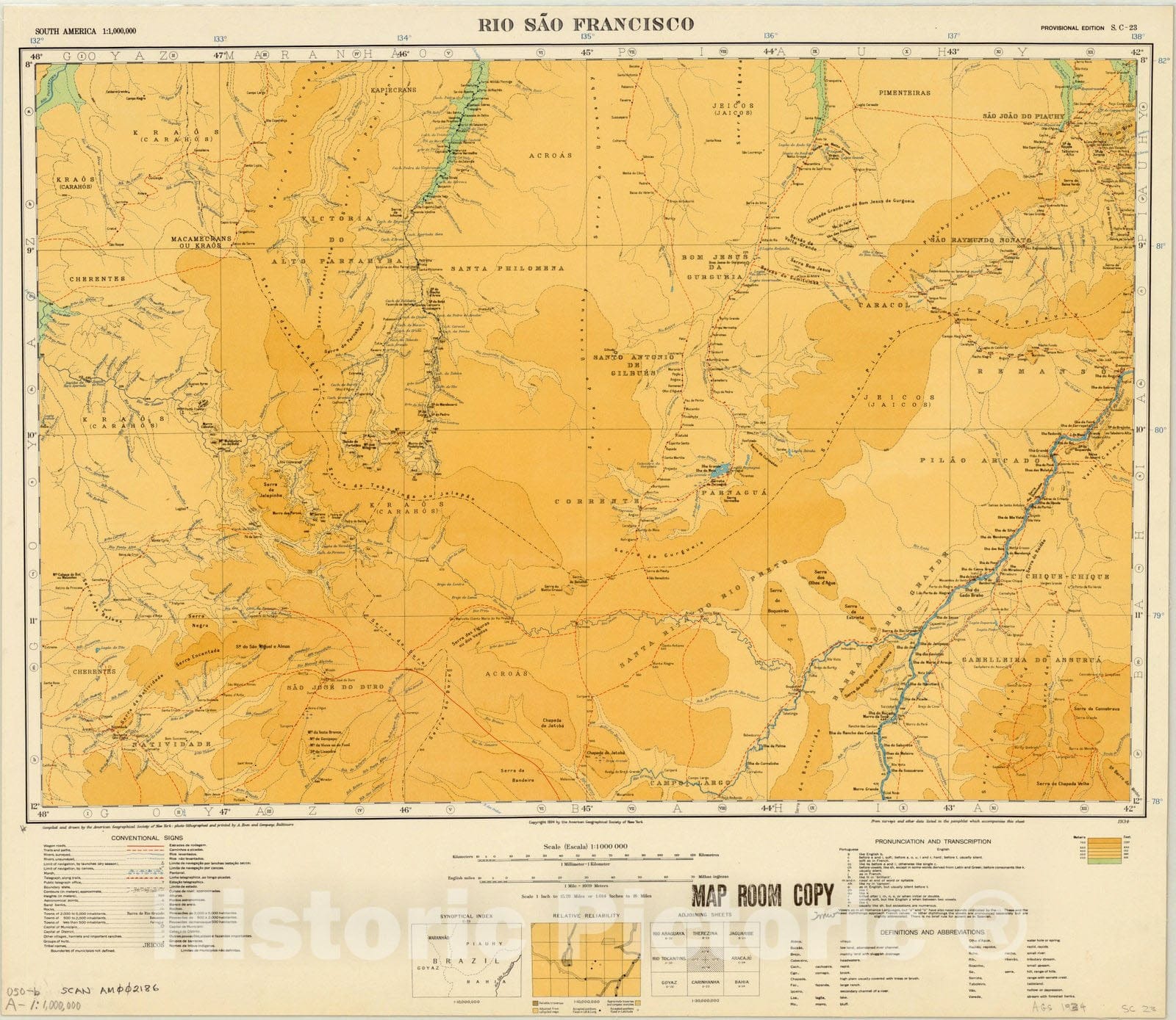 • .Map : Rio Sao Francisco, Brazil 1934, Map of Hispanic America, Antique Vintage Reproduction