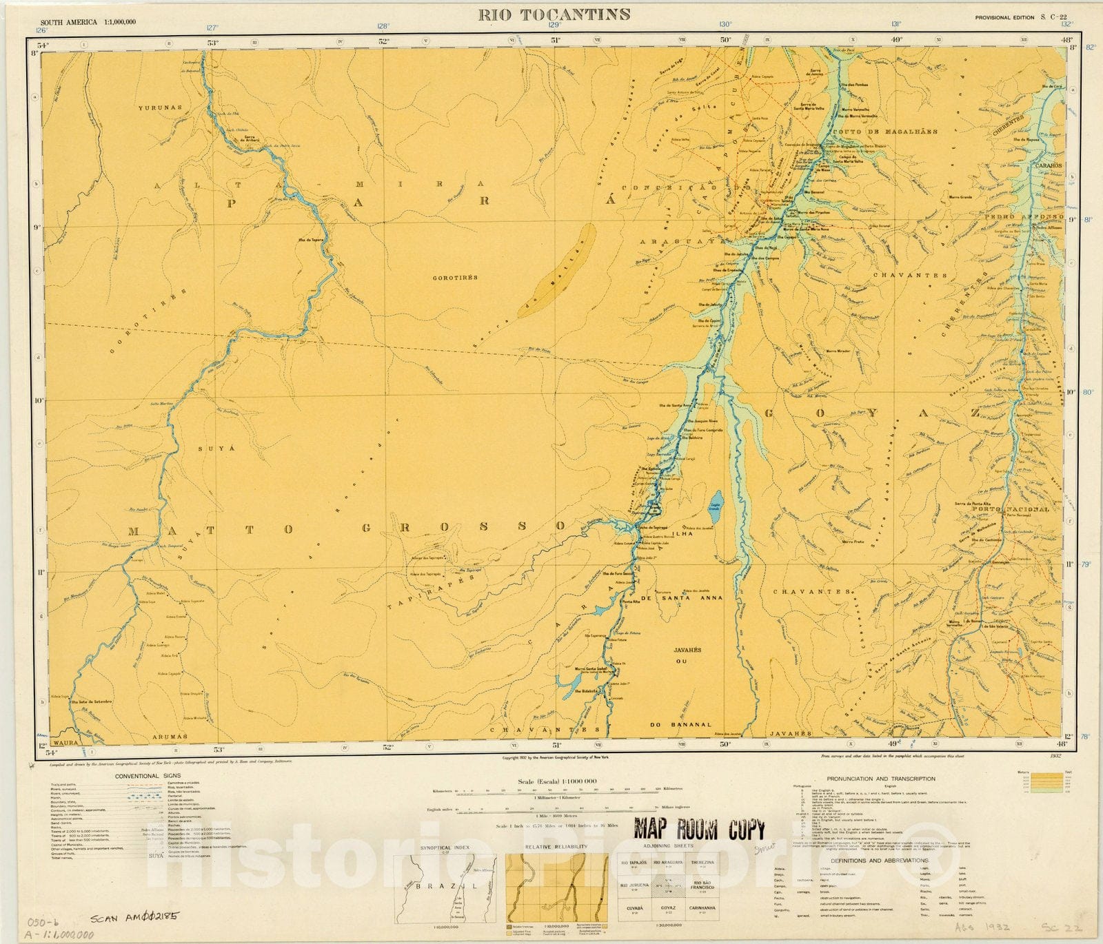 Map : Rio Tocantins, Brazil 1932, Map of Hispanic America, Antique Vintage Reproduction