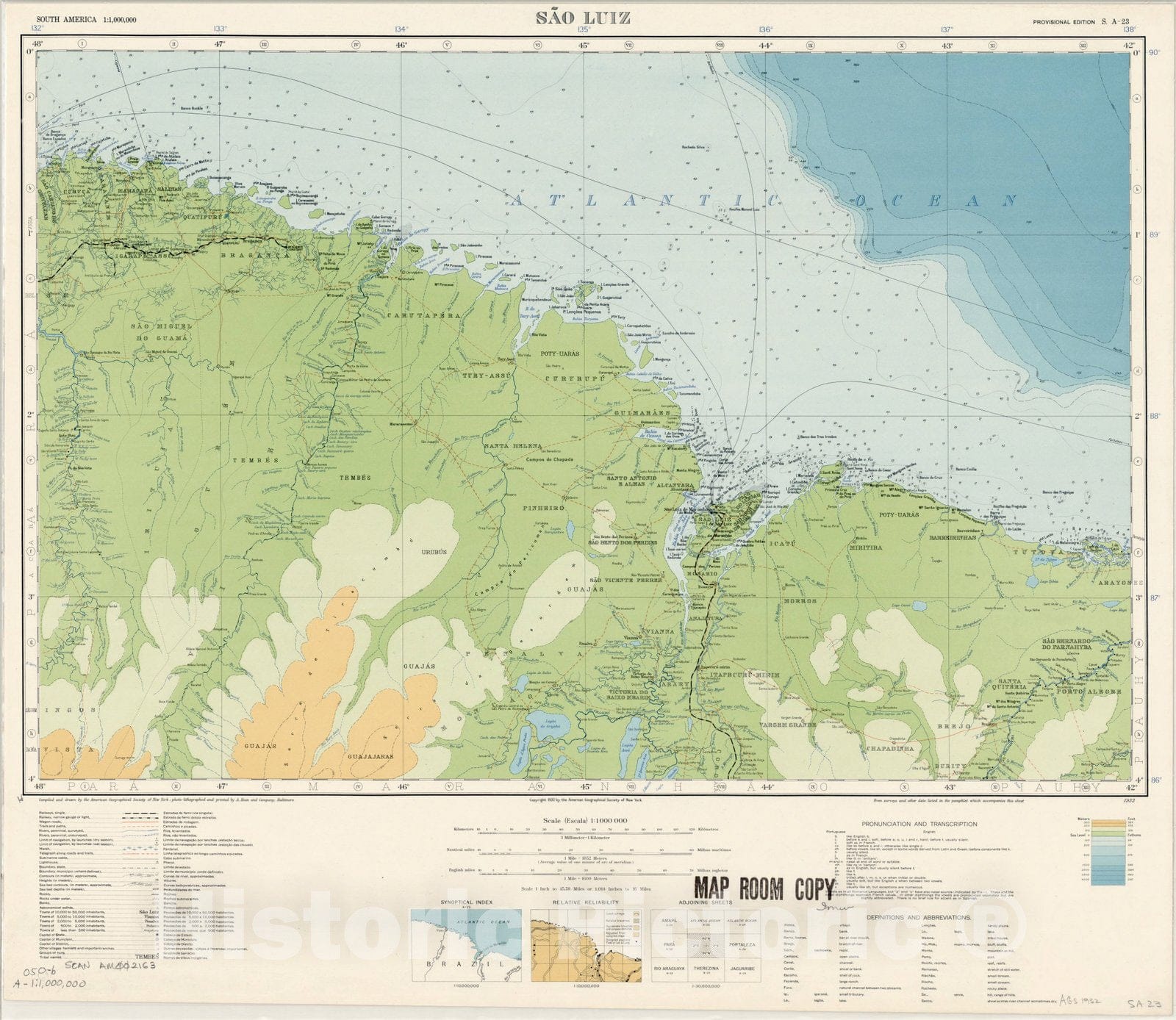Map : Sao Luiz, Brazil 1932, Map of Hispanic America, Antique Vintage Reproduction
