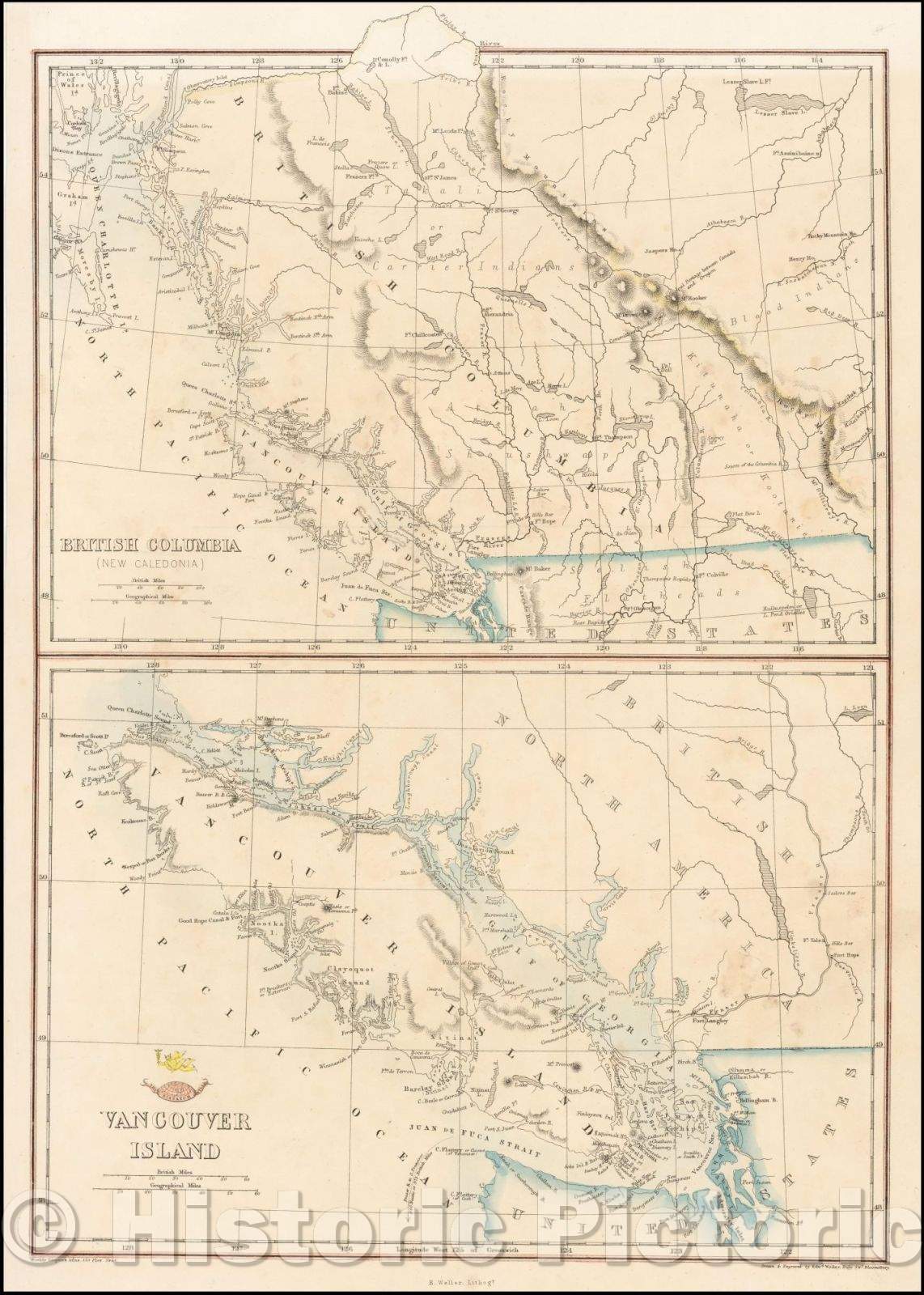 Historic Map - British Columbia (New Caledonia) and Vancouver Island, 1858, Edward Weller - Vintage Wall Art