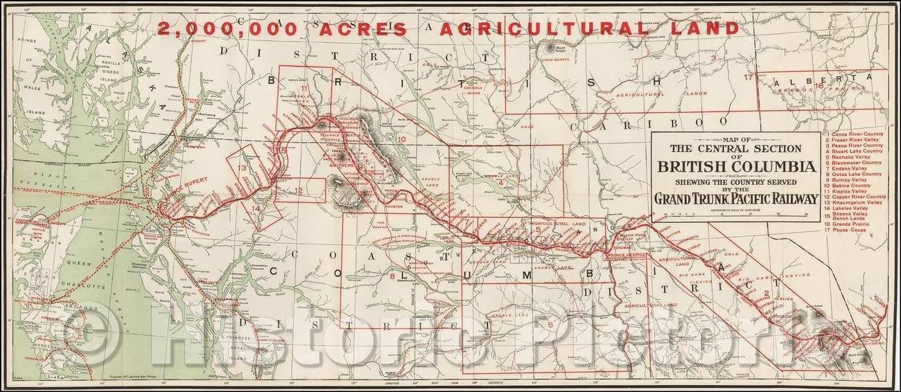 Historic Map - Map of the Central Section of British Columbia Shewing The Country Served, 1911, Poole Brothers - Vintage Wall Art