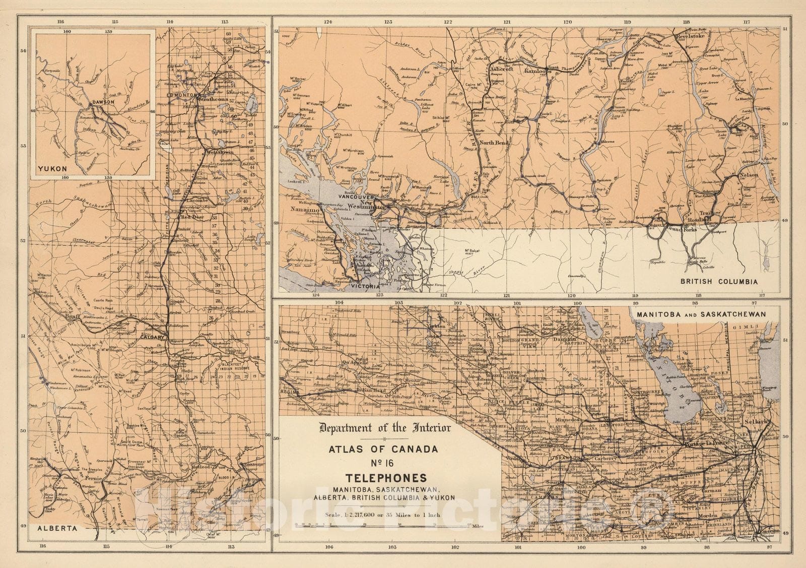 Department of Interior : Atlas of Canada, No.16, Telephone : Manitoba, Saskatchewan, Alberta, British Columbia & Yukon. (to accompany) Department of the Interior, Canada ... 1906. (inset) Yukon. | Department of the Interior, Canada. Honorable Frank Oliver, Minister, 1906. Atlas of Canada. Prepared under the direction of James White, F.R.G.S., Geographer. (on verso of title page) The Toronto Lithographing Company, Limited; Map engravers, and dedication note. | Full color, 21 p., 83 plates including maps and diagrams. The Atlas of Canada, first edition published by the Department of the Interior in 1906, was one of the world's first national atlases. A second edition similar in style and content was published in 1915, both editions, featuring thematic maps dealing with Canada's geology, communications, natural resources, population, economic activities, transportation, as well as maps of principal cities. During this period, a major part of Canada's growth was due to the great influx of immigrants into Canada, many of them coming to open up the farmlands of the Prairies. Consequently, the first two editions of the Atlas of Canada reflect a particular interest in transportation and communications and devote a significant amount of space to mapping the composition and density of the population. Bound in half leather brown covered boards with "Department of Interior 1906 Atlas of Canada." in gilt. Atlas is bound in half leather brown cloth covered boards with "Department Of The Interior. 1906. Atlas of Canada."
