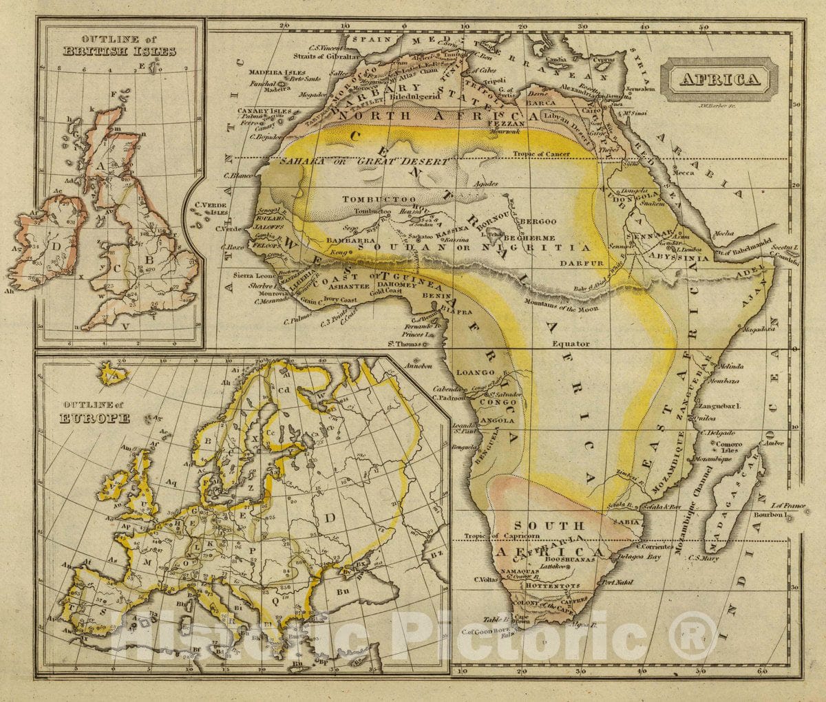 Historic Map : Africa. J.W. Barber sc. (with) Outline of British Isles. (with) Outline of Europe. (Published by Richardson & Lord, 1828 Atlas - Vintage Wall Art