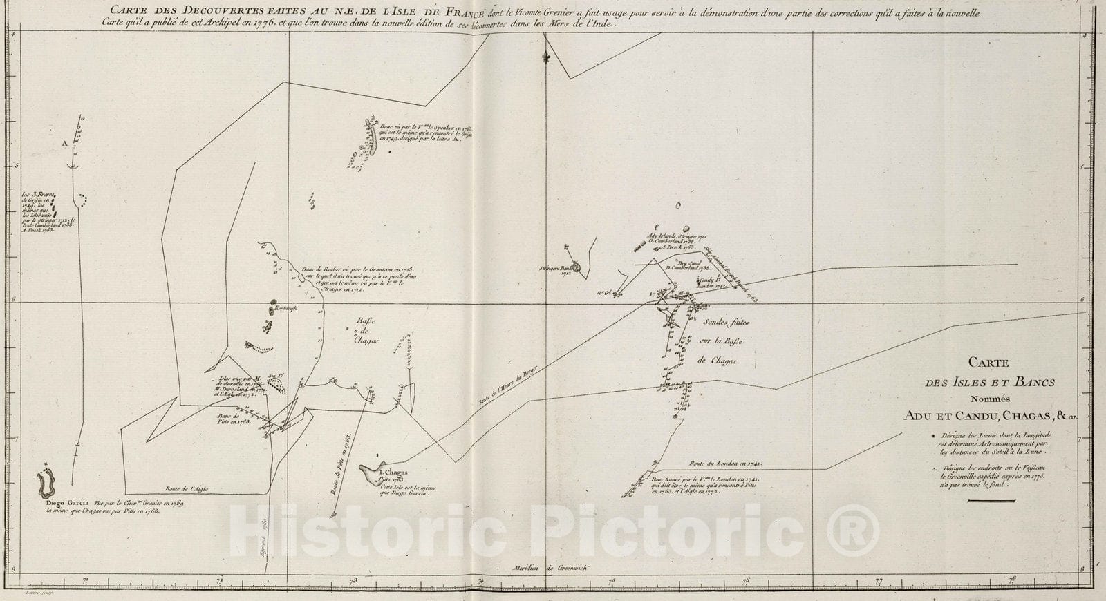 Historic Map : British Indian Ocean TerritoryCarte des Isles det Bancs Nommes Adu et Candu, Chagas, ca. 1804 , Vintage Wall Art