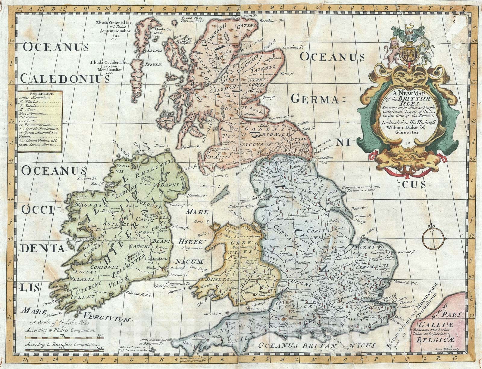 Historic Map : The British Isles in Antiquity "England, Wales, Scotland, Ireland", Wells, 1712, Vintage Wall Art