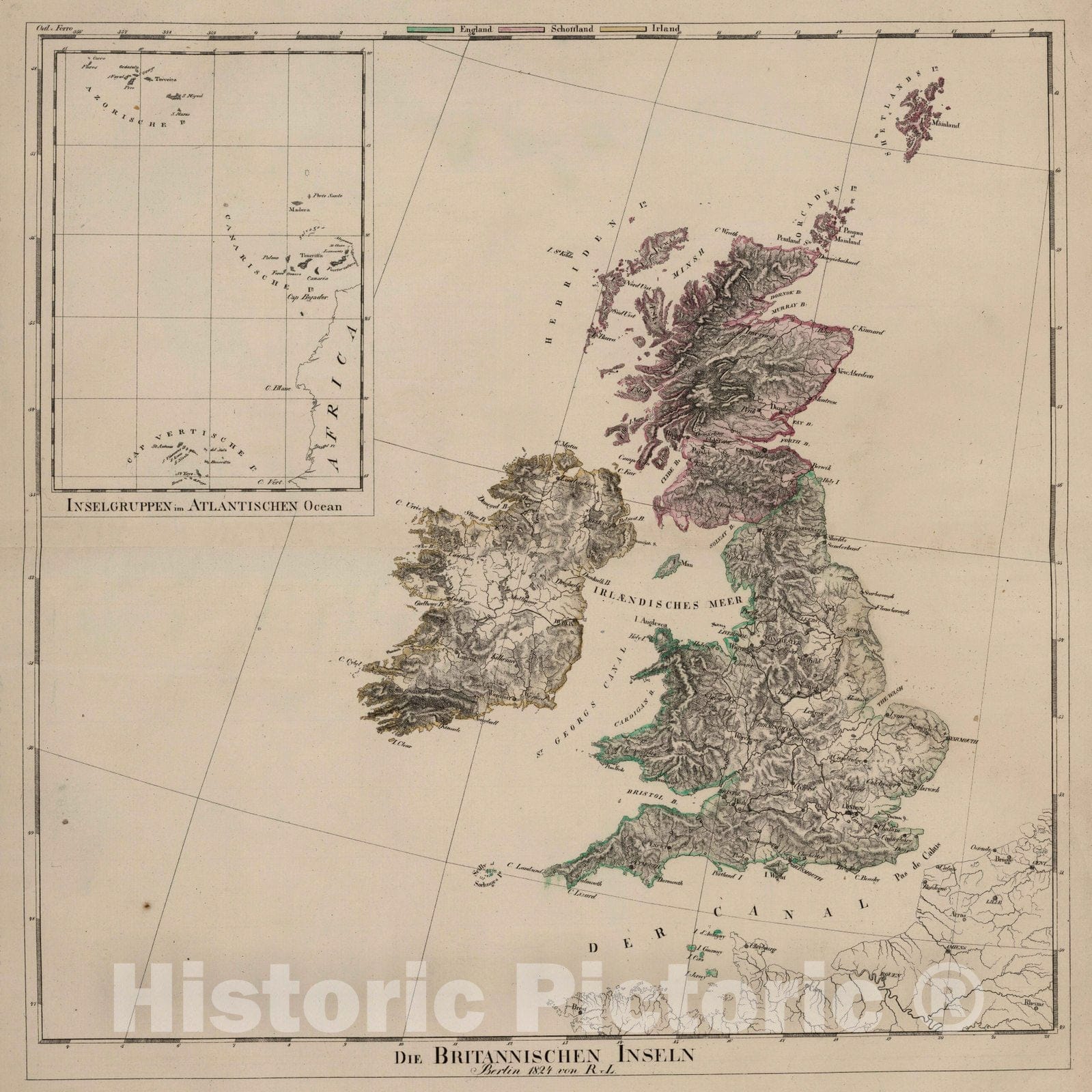 Historic Map : England; Wales; Scotland; Ireland, British Isles 1824 Die Britannischen Inseln. Inselgruppen im Atlantischen Ocean. , Vintage Wall Art