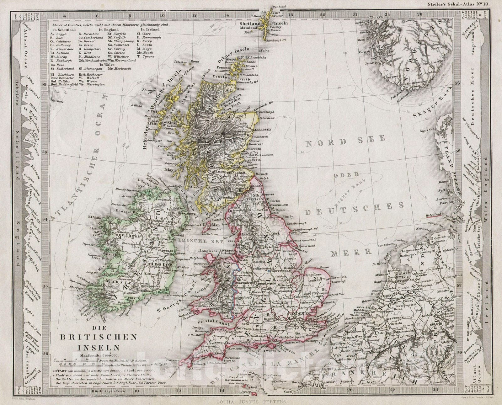 Historic Map : Stieler Map of The British Isles (England, Ireland, Scotland) , 1862, Vintage Wall Art