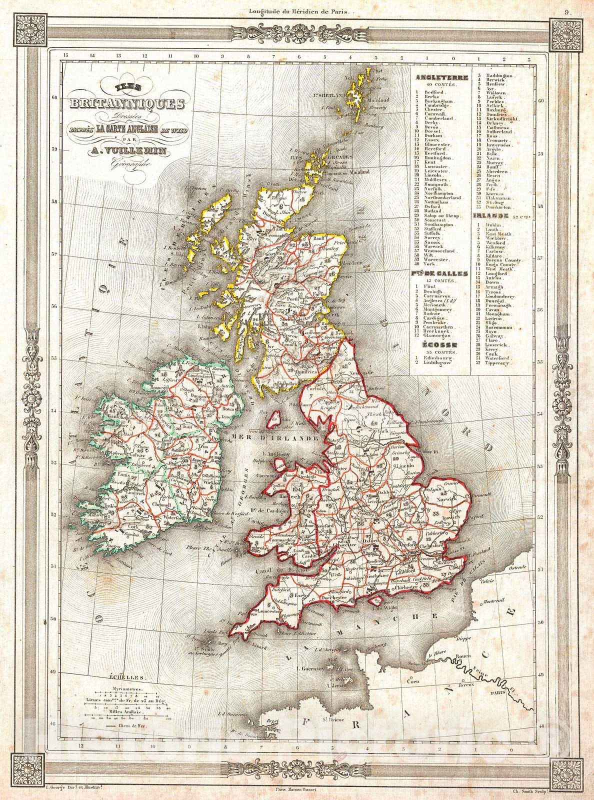 An uncommon and attractive 1852 map of the British Isles by A. Vuillemin. Details England, Scotland and Ireland as well as parts of neighboring France. Based on an earlier map by the English mapmaker Wild. Upper right corner features a list of counties which are numerically coded into the map. Features a beautiful frame style border. Prepared by A. Vuillemin for publication as plate no. 9 in Maison Basset's 1852 edition of the Atlas Illustre .