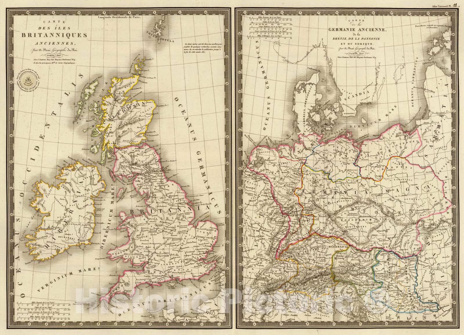 Historic Wall Map : England; Germany, British Isles 1827 Iles Britanniques anciennes, Germanie ancienne, Rhetie, Pannonie, Norique. , Vintage Wall Art
