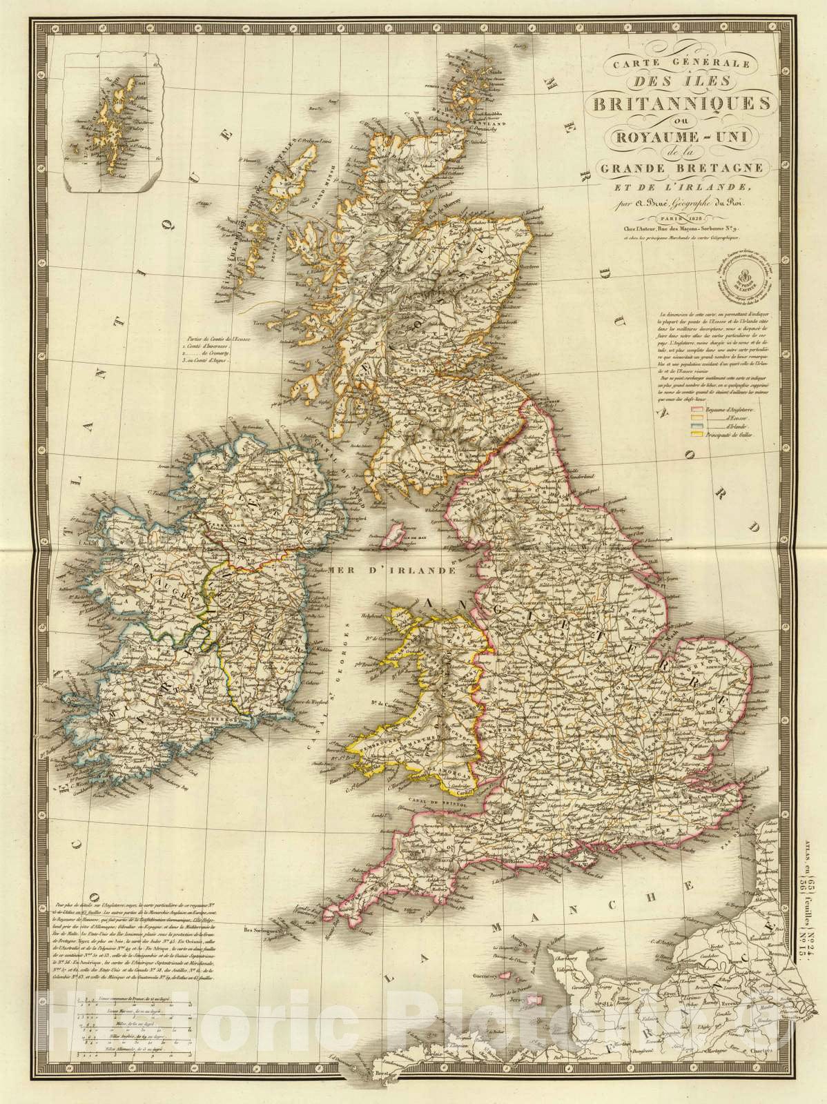 Historic Wall Map : England; Ireland, British Isles 1828 Iles Britanniques. , Vintage Wall Art