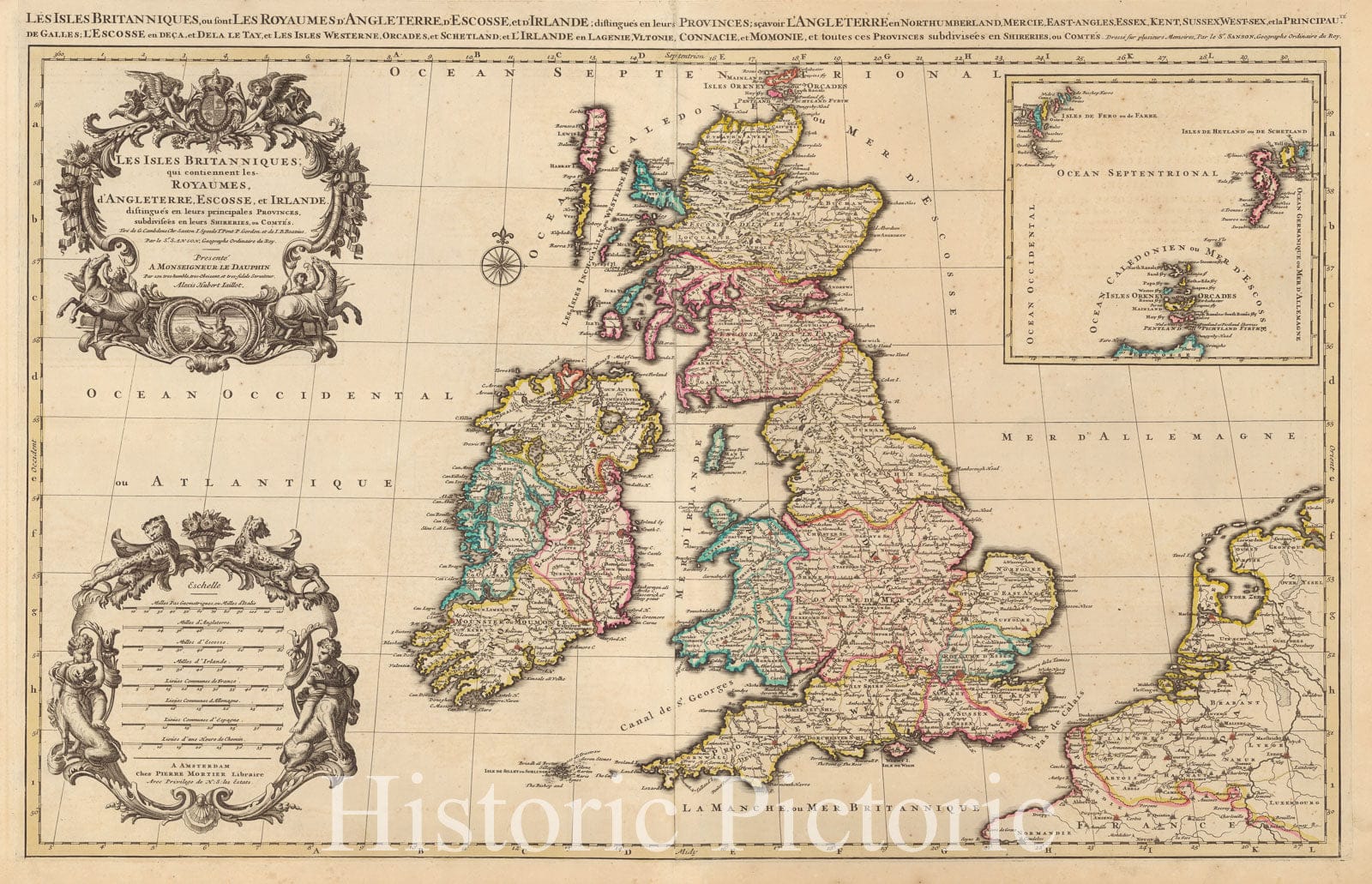 Historic Map : The British Isles which contain the Kingdoms of England, Scotland, and Ireland distinguished in their principal Provinces, subdivided into their Shire, c. 1692 , Vintage Wall Art