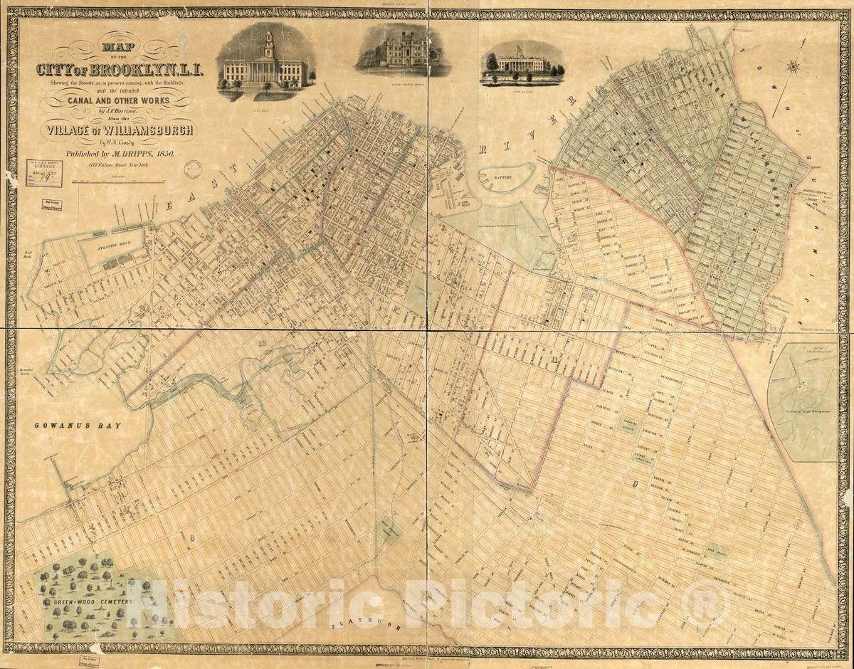 Historic 1850 Map - Map of The City of Brooklyn, L.I. : shewing The Streets as at Present existing with The Buildings and The Intended Canal and Other Works