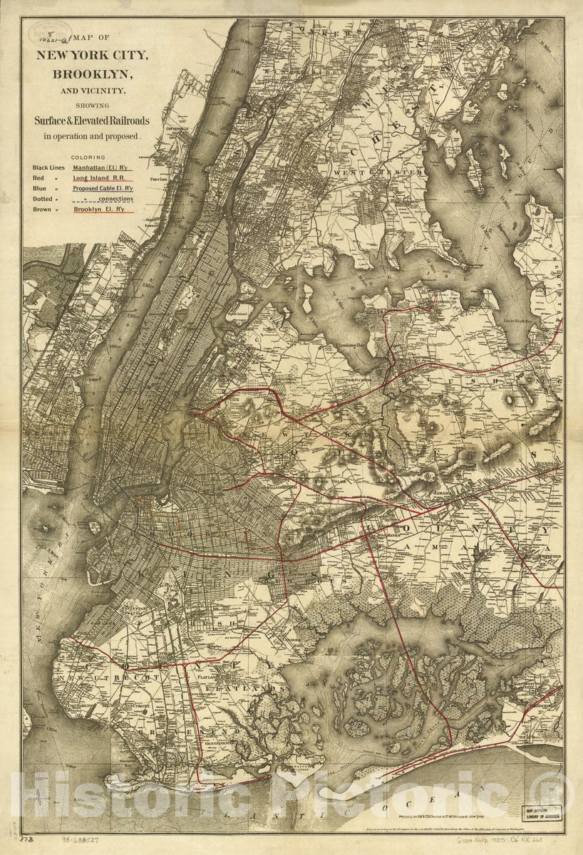 Historic 1885 Map - Map of New York City, Brooklyn, and Vicinity Showing Surface & Elevated Railroads in Operation and Proposed.