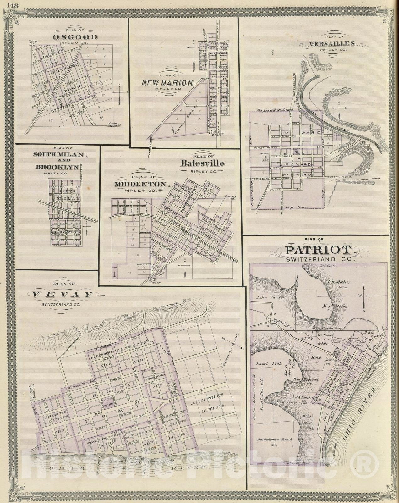 • .Historic Map : 1876 Plan of Vevay, Switzerland Co. (with) Patriot, Versailles, Osgood, New Marion, South Milan, Brooklyn, Middleton, Batesville. - Vintage Wall Art