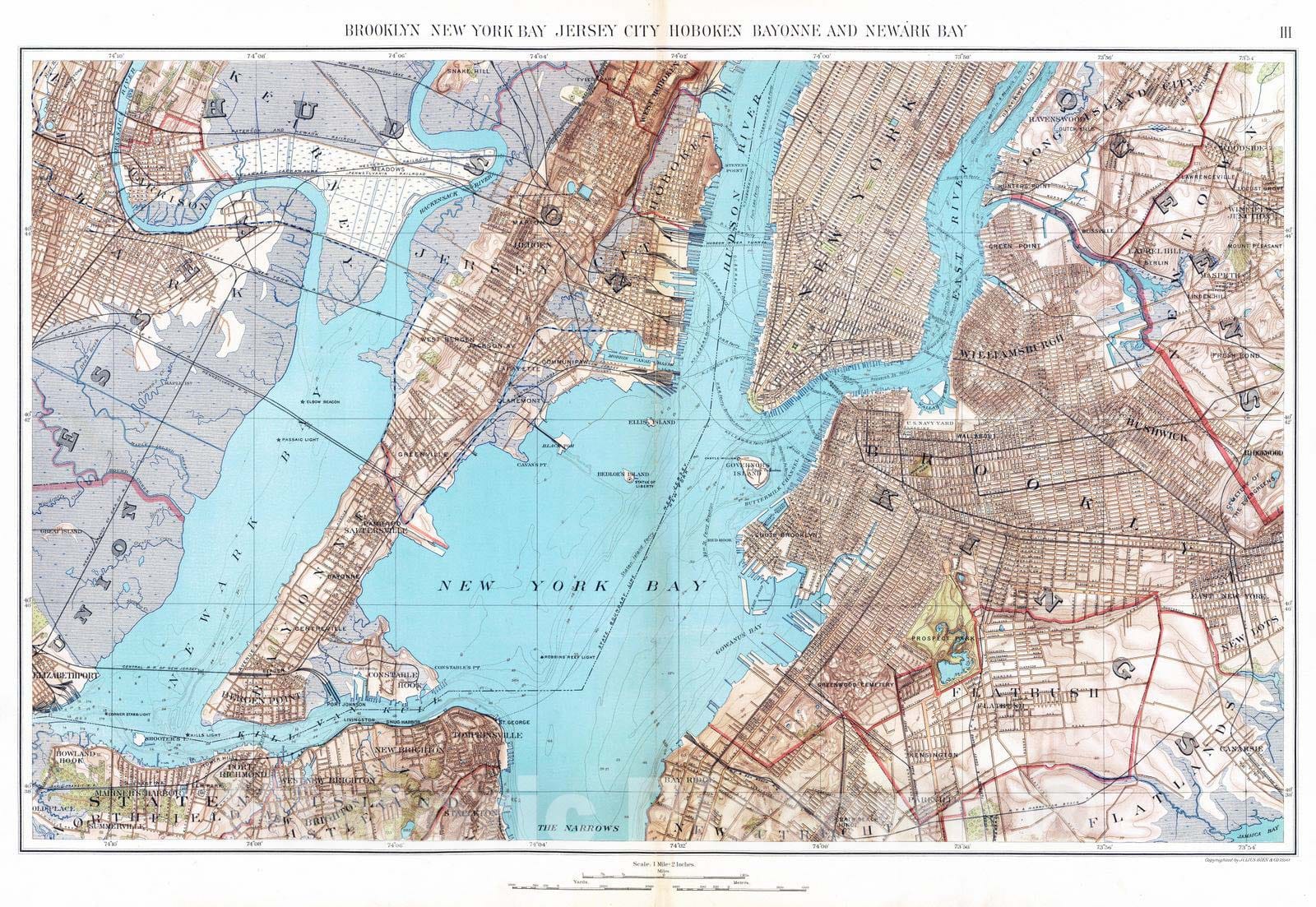 Historic Map : City Atlas - 1891 Brooklyn, N.Y. Bay, Jersey City, Hoboken, Bayonne, Newark Bay. - Vintage Wall Art