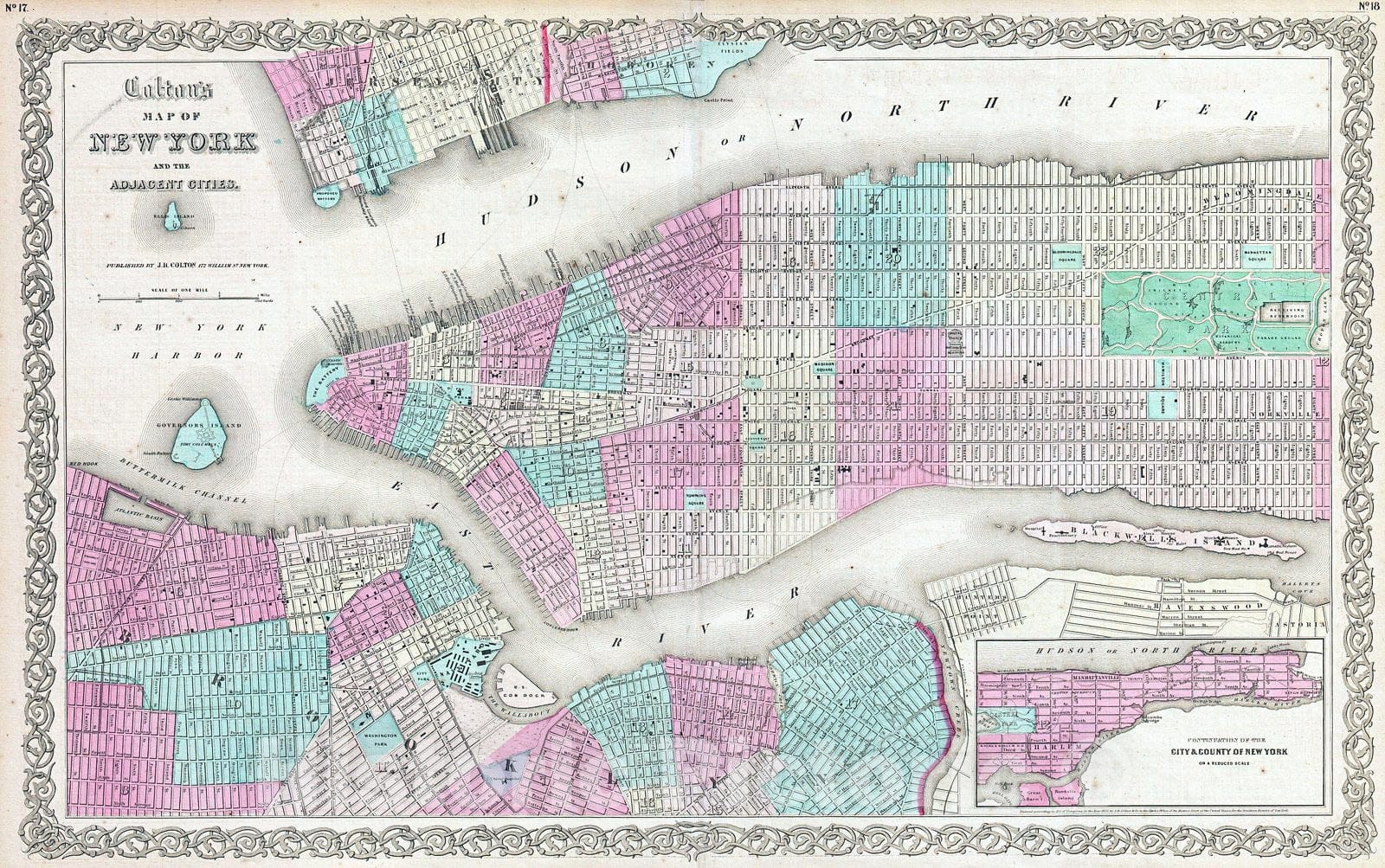 This is a beautiful J. H. Colton map of New York City and vicinity, including Manhattan as well as parts of Brooklyn, Jersey City, Hoboken, and Queens. This is the third state of the Colton New York City map in which Central Park is depicted according to an early version of the Olmstead plan. This important map would become the template from which Johnson and late later S. A. Mitchell Jr. would build their own New York City maps. Map is a lithograph from a steel plate engraving. Beautiful hand color. Wonderful attention to detail includes individual streets and even important buildings and parks. Originally prepared as plates no 17 and 18 in J. H. Colton's 1861 issue Atlas of the World… . Dated and copyrighted: "Entered according to the Act of Congress in the Year of 1855 by J. H. Colton & Co. in the Clerk's Office of the District Court of the United States for the Southern District of New York." Published from Colton's 172 William Str. Office in New York.