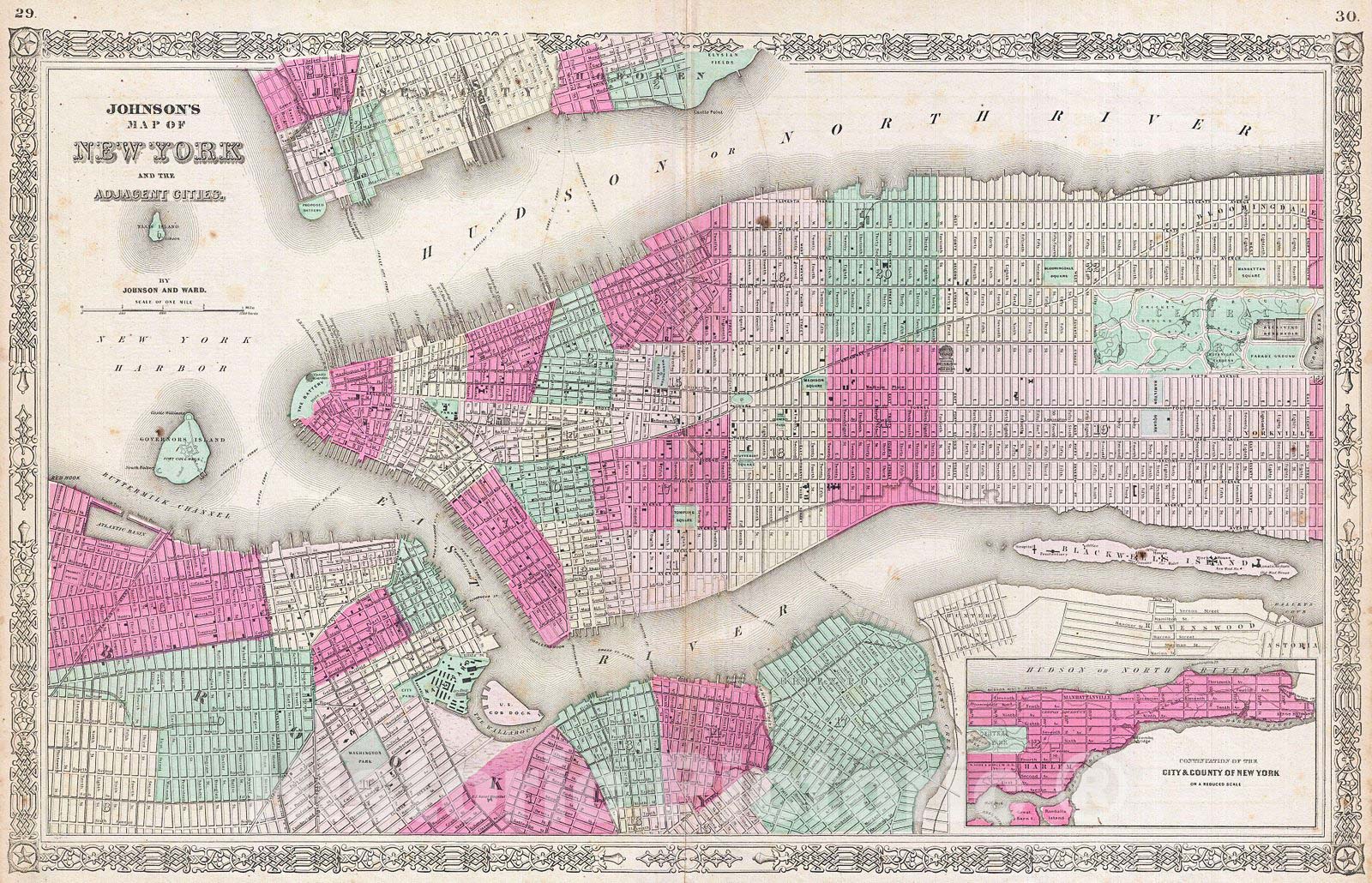 A fine hand colored map of New York City and Brooklyn dating to 1865. Covers the island of Manhattan and the borough of Brooklyn as well as parts of Jersey City and Hoboken. Johnson's plan is heavily based upon the third state of J. H. Colton's New York City atlas map. Central Park is shown in great detail and in and earlier incarnation than we know today with the Receiving Reservoir in the place of today's Great Lawn. The important ferries running between New York, Brooklyn, Queens, and New Jersey, are all noted. In Queens we can see the newly built Long Island Railroad leaving Flushing station at Hunter's Point. At the tip of Roosevelt Island where now stands a decrepit ruin, there Johnson notes a civil war hospital. Represents Page no. 29 - 30 in the 1865 Johnson and Ward edition of Johnson's Family Atlas . This is the last edition of this map to bear the Johnson and Ward imprint.