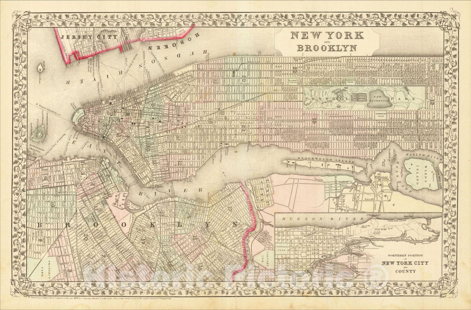 Historic Map : New York and Brooklyn, 1871, Samuel Augustus Mitchell Jr., Vintage Wall Art