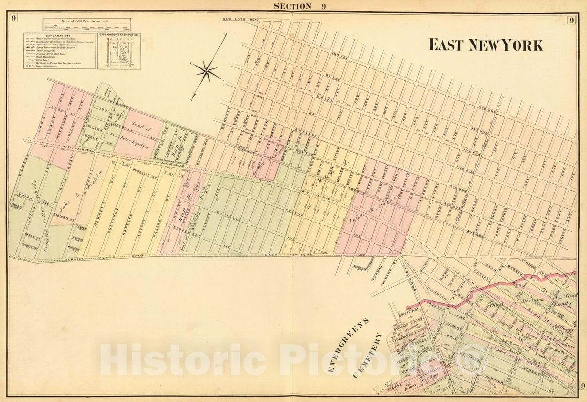 Historic Map : Section 9. East New York. (Farm line map of The City of Brooklyn. Compiled and Drawn by Henry Fulton. 1874), 1874 City Atlas - Vintage Wall Art