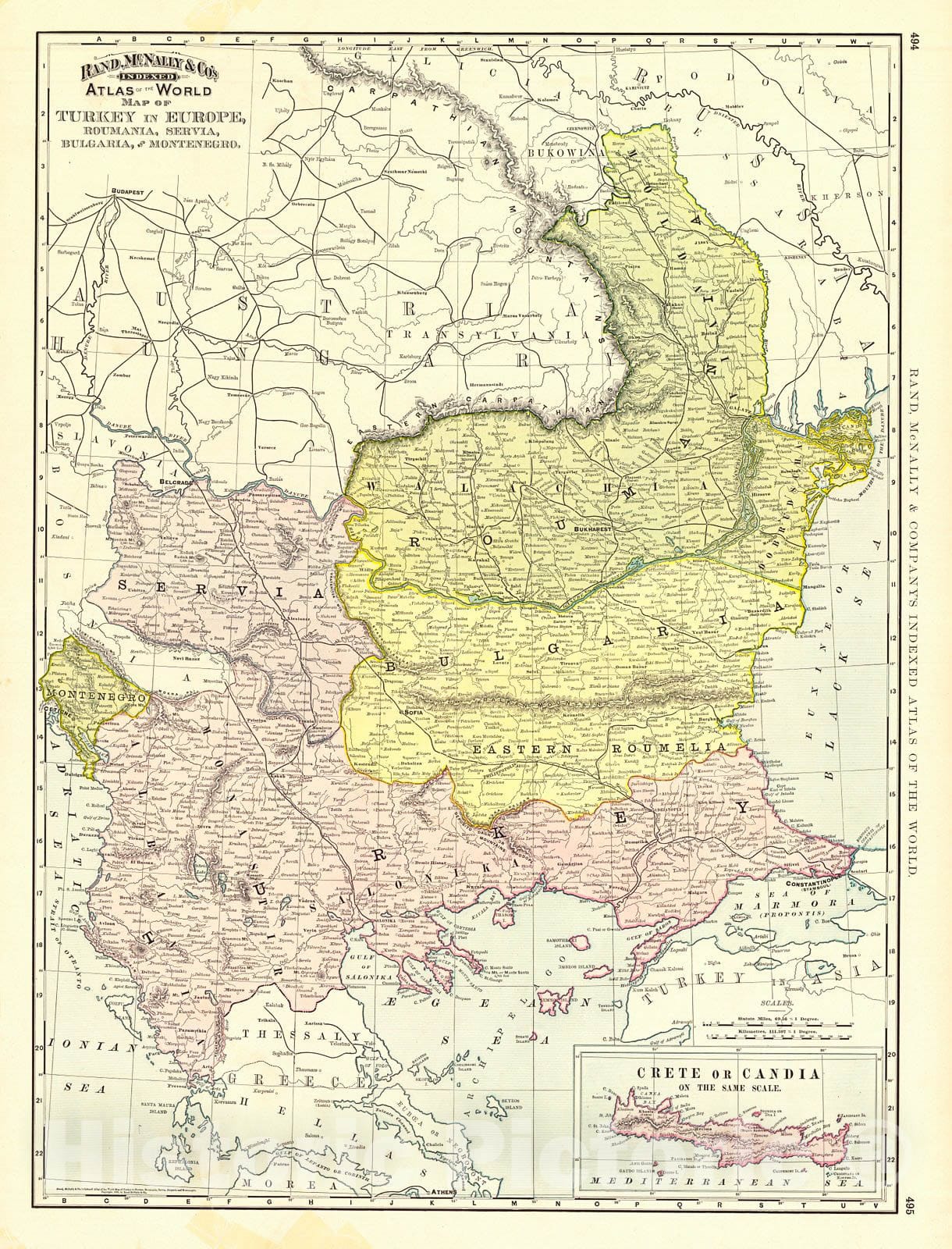 Vintage Map | 1892 Map of Turkey in Europe, Roumania, Servia, Bulgaria, and Montenegro | Rand McNally and Company