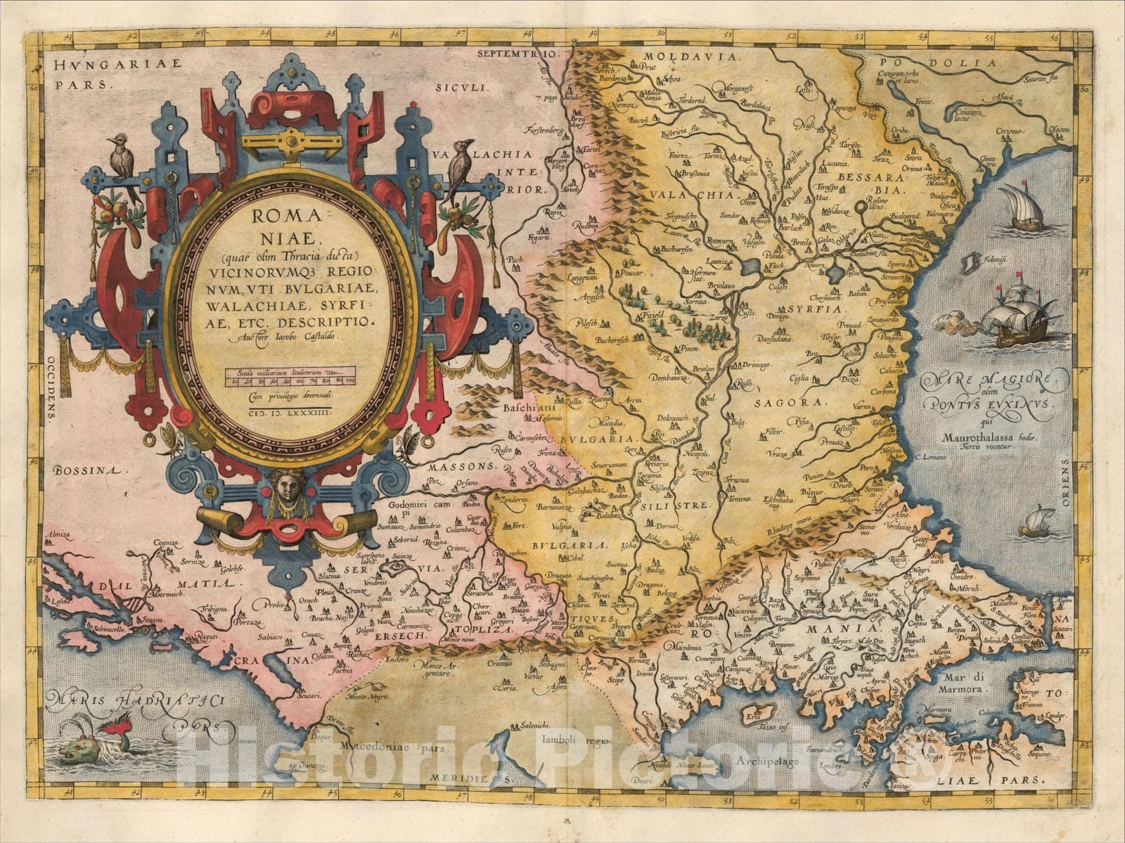 • .Historic Map : Romaniae, (quae olim Thracia dicta) Vicinarumque Regionum, Uti Bulgariae, Walachiae, Syrfiae, etc. Descriptio., 1584, Abraham Ortelius, Vintage Wall Art