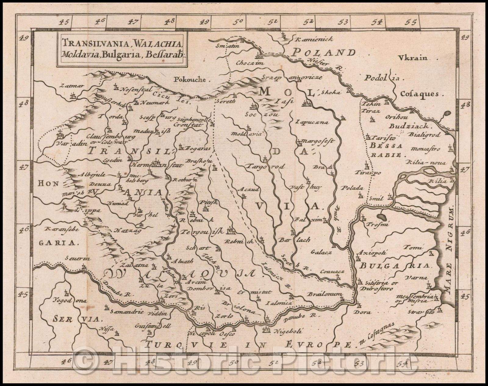 • .Historic Map - Transilvania, Walachia, Modovia, Bulgaria, Bessarab: / Map of Bulgaria, Walachia, Moldova, Transilvania, Bessarbie and part of Poland, 1681 - Vintage Wall Art