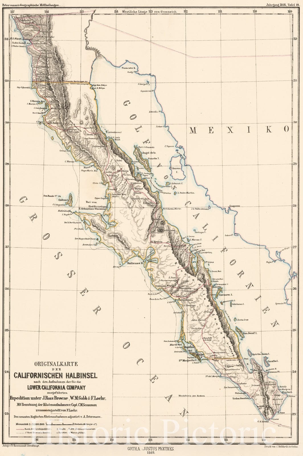 Historic Map - Originalkarte Der Californischen Halbinsel nach den Aufnachmen/Map of Baja California, Tijuana and south to Cabo San Lucas, 1868 - Vintage Wall Art
