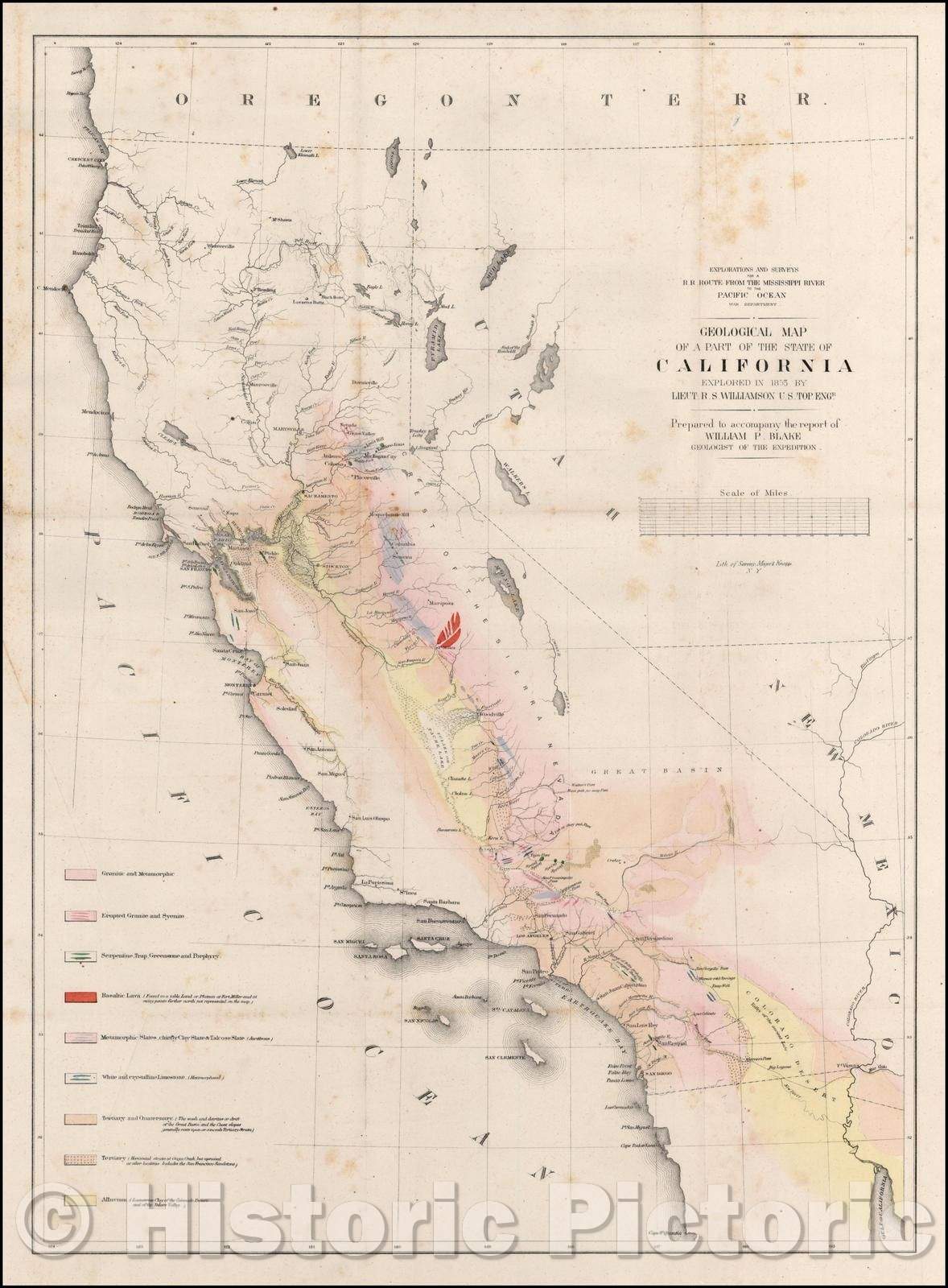 Historic Map - Geological Map of a Part of the State of California Explored in, 1853, U.S. Pacific RR Survey - Vintage Wall Art