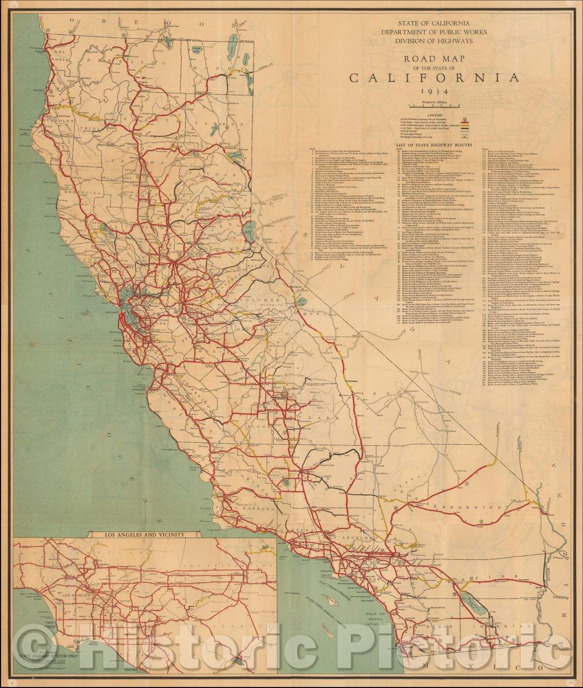 Historic Map - Road Map of the State of California, 1934, State of California Division of Highways - Vintage Wall Art