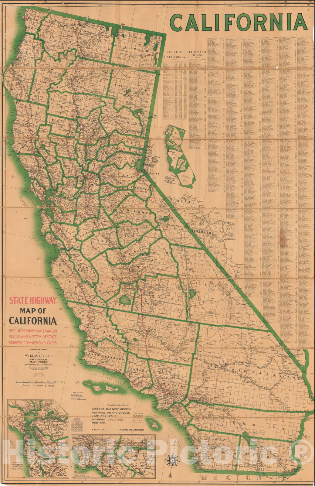 Historic Map : State Highway Map of California Red Lines Show State Wagon Roads and System of State Highway Commission Surveys, 1913, W. Elliott Judge, Vintage Wall Art